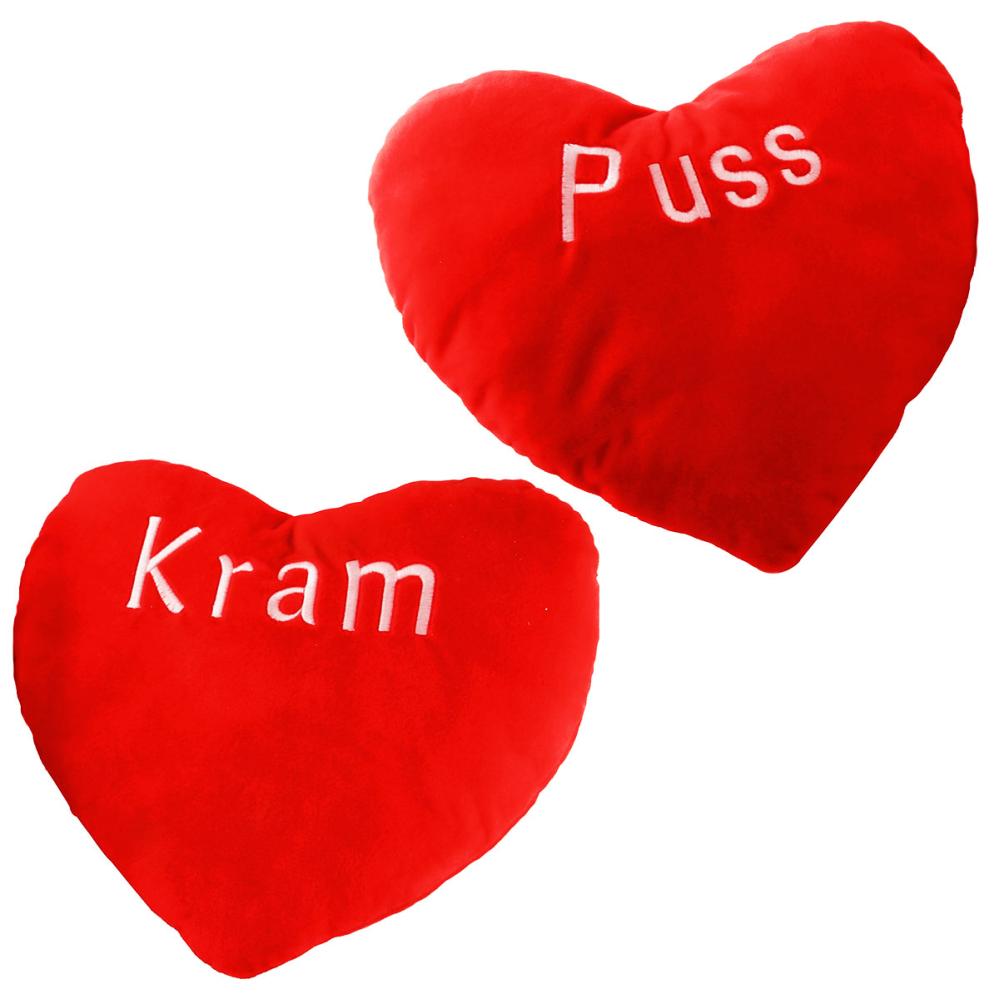 - Sydämenmuotoinen tyyny tekstillä "Puss" tai "Kram"