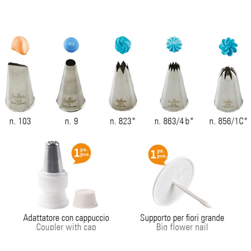 Tämän pursotinsetin ansiosta koristelu on helppoa, sillä settiin sisältyvät tyllat, tyllaliitin ja kukkaneula. Monipuoliset pursotustyllat mahdollistavat kauniiden yksityiskohtien luomisen sekä kakkuihin että kuppikakkuihin korkealla tarkkuudella.