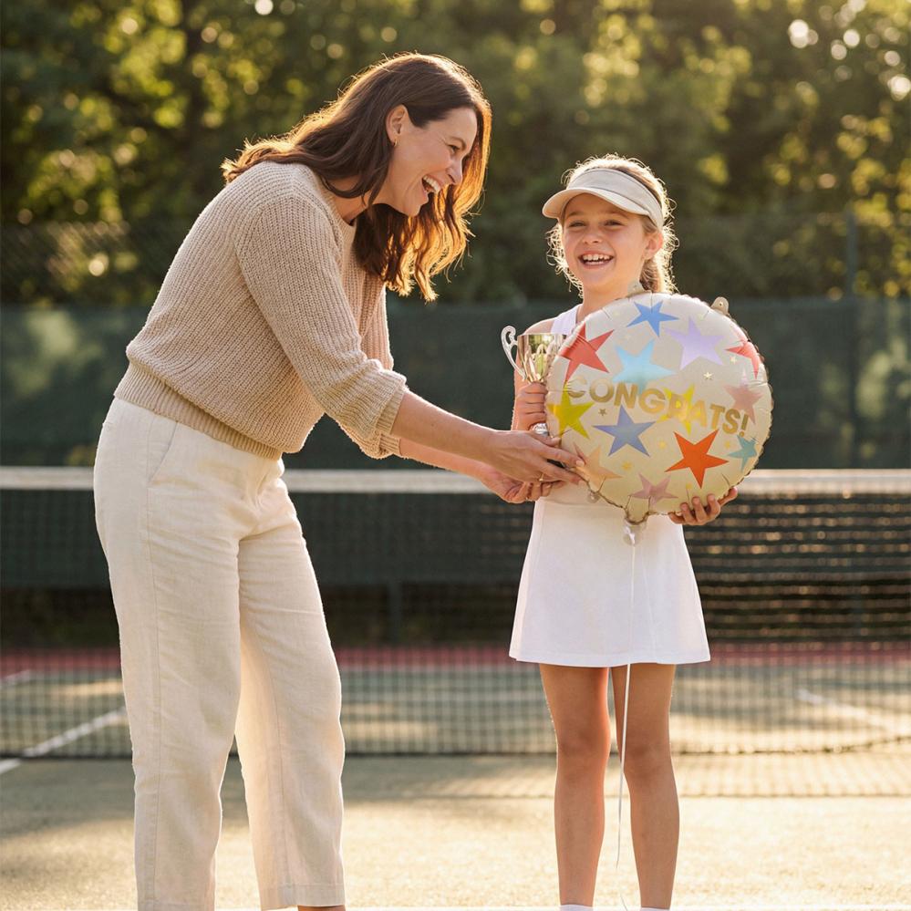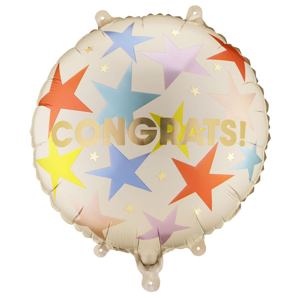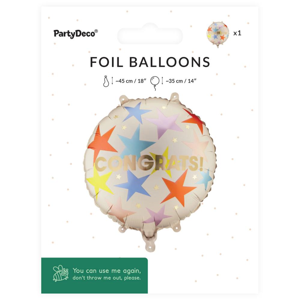 Pyöreä Folioilmapallo Congrats 35 cm sisältää pyöreän, mattabeigen folioilmapallon, jossa on suuria tähtiä eri väreissä sekä pieniä tähtiä ja teksti ‘CONGRATS!’ hohtavan kullanvärisenä. Voidaan täyttää ilmalla tai heliumilla, ja mukana toimitetaan pilli täyttämistä varten.