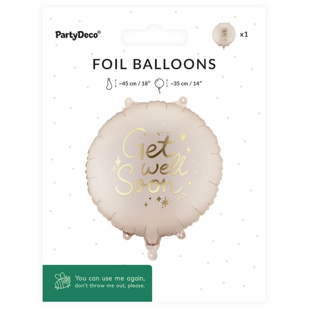 Pyöreä Folioilmapallo Get Well Soon 35 cm on pyöreä, mattabeigen värinen folioilmapallo, jota koristaa teksti 'Get Well Soon' ja jota ympäröivät tähdet, joissa sekä teksti että tähdet ovat hohtavan kullanvärisiä. Ilmapallo voidaan täyttää ilmalla tai heliumilla, ja sen mukana toimitetaan pilli täyttämistä varten.