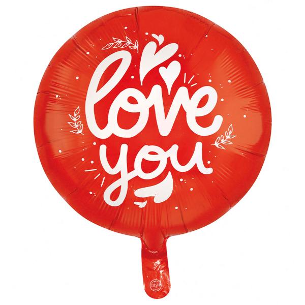 Pyöreä Folioilmapallo Love You 46 cm sisältää pyöreän, punaisen folioilmapallon, jossa on valkoinen kuvio sydämistä, terälehdistä ja tekstistä "love you".