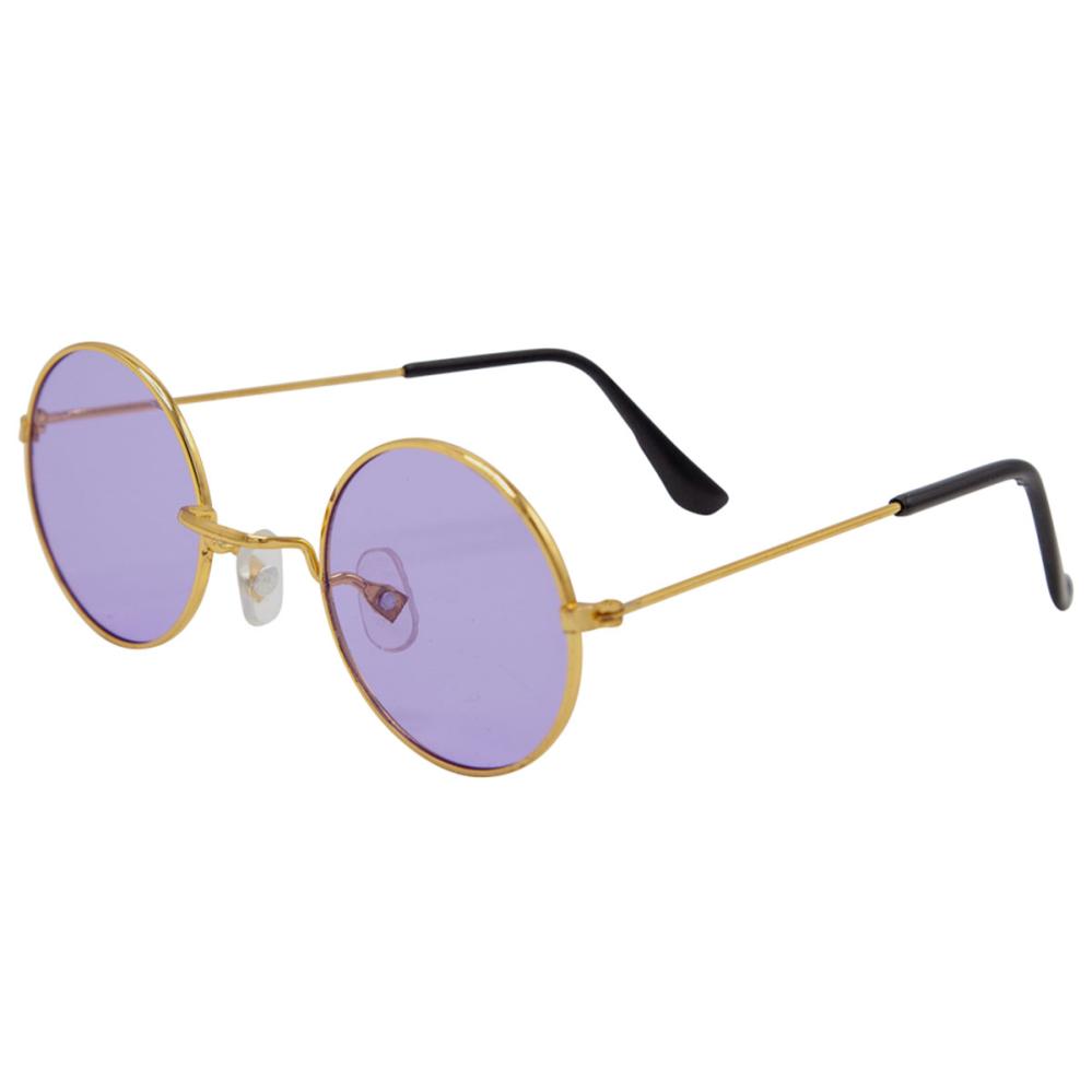Naamiaisia tai juhlia varten sopivat hippien inspiroimat silmälasit, joissa on pyöreät liilat linssit ja kullanvärinen muovikehys. Nämä muovisilmälasit ovat kevyet ja niitä voi yhdistää vaatteisiin, peruukkiin tai hattuun.