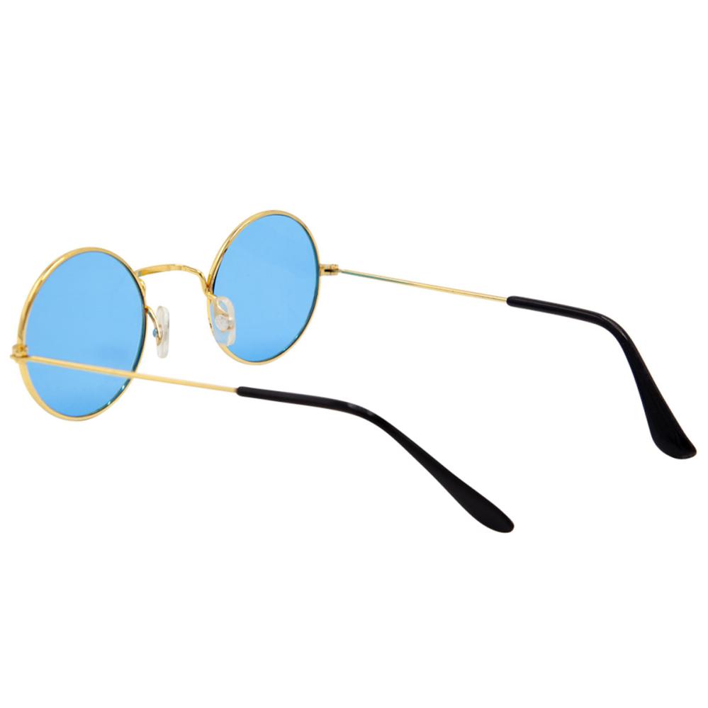 Pyöreät Silmälasit Hippi Siniset sisältää yhdet pyöreät muovisilmälasit, joissa on siniset linssit, kullanvärinen kehys ja mustat sankojen päät.