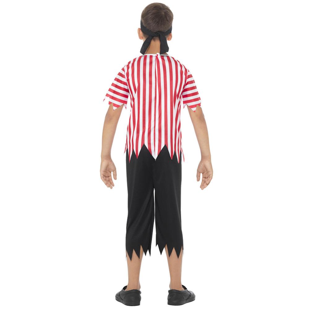 Raidallinen Merirosvoasu Lapsille sisältää lasten asun, johon kuuluu bandana, musta silmälappu, mustat housut ja raidallinen T-paita valkoisena ja punaisena, jonka etupuolella on painettuna musta merirosvolaiva.