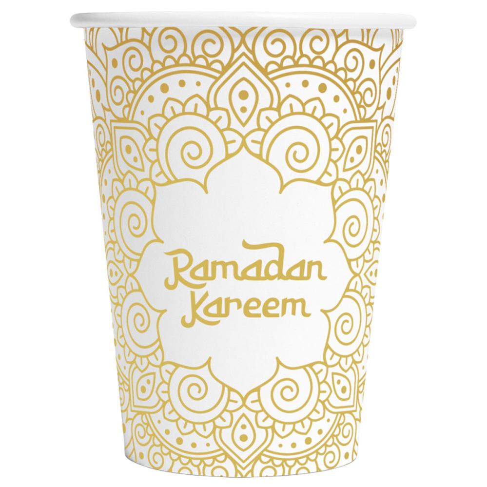 Juhli tyylillä hankkimalla seuraaviin Ramadan-teemaisiin juhliisi kertakäyttömukit. Näissä 8 kappaleen mukeissa on elegantti kuviointi, mattakultainen teksti, ja ne sopivat täydellisesti Ramadan-kattauksen tarvikkeiksi niin suuriin kuin pieniin tilaisuuksiin.