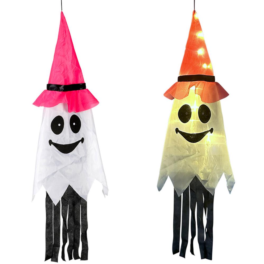 Riippuva Haamu LED-valolla 100 cm sisältää roikkuvan koristeen valkoisen haamun muodossa, jossa on vaaleanpunainen noitahattu ja mustia kangassuikaleita, jotka riippuvat alas luoden aavemaisen vaikutelman. Kun koriste aktivoidaan, useat sisäänrakennetut LED-valot valaisevat hahmon ja luovat tunnelmallisen valaistuksen.