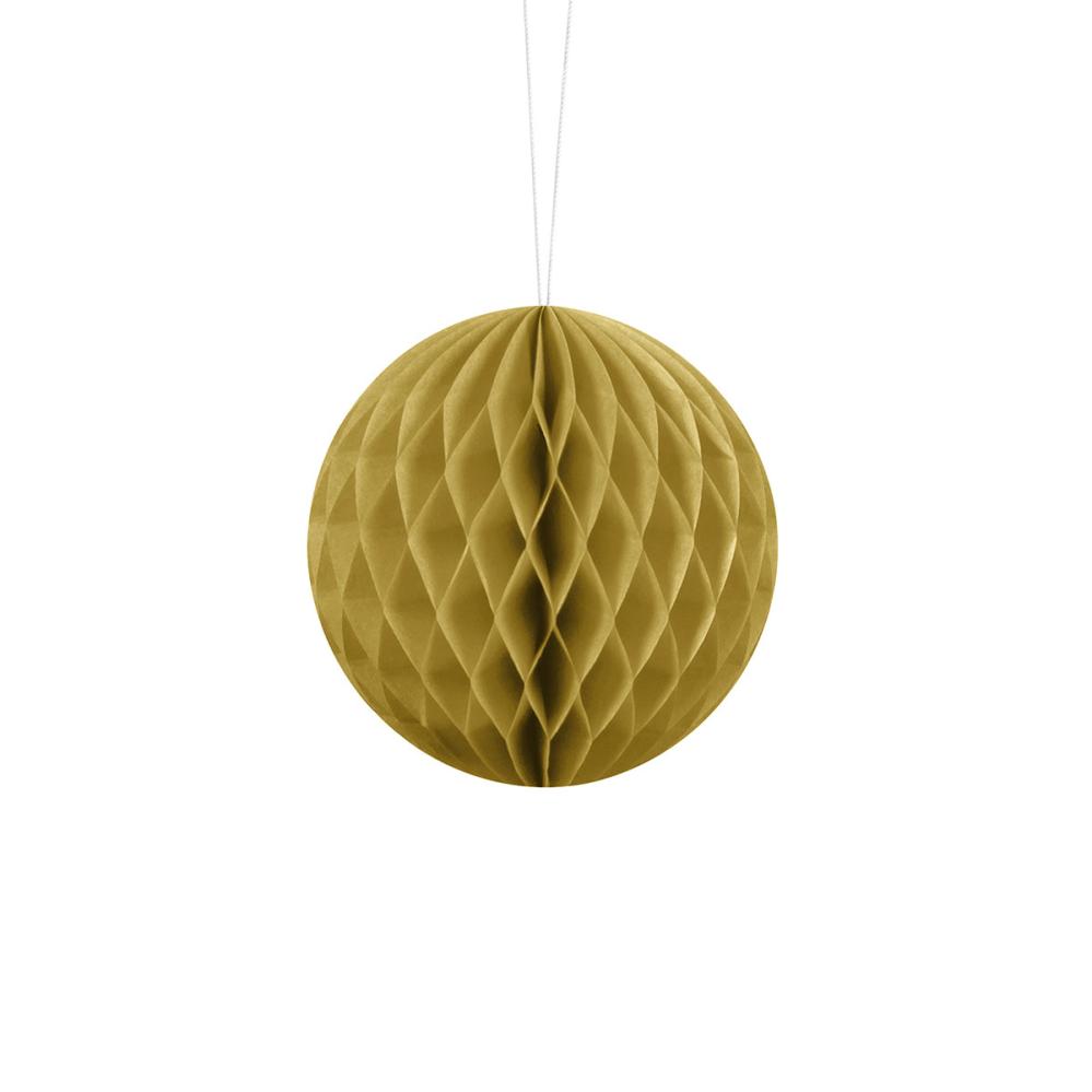 Riippuva Hunajakenno Kulta 10 cm sisältää kullanvärisen, pallomaisen hunajakennon, jossa on klipsit helppoa kokoamista varten ja valkoinen naru ripustamiseen.