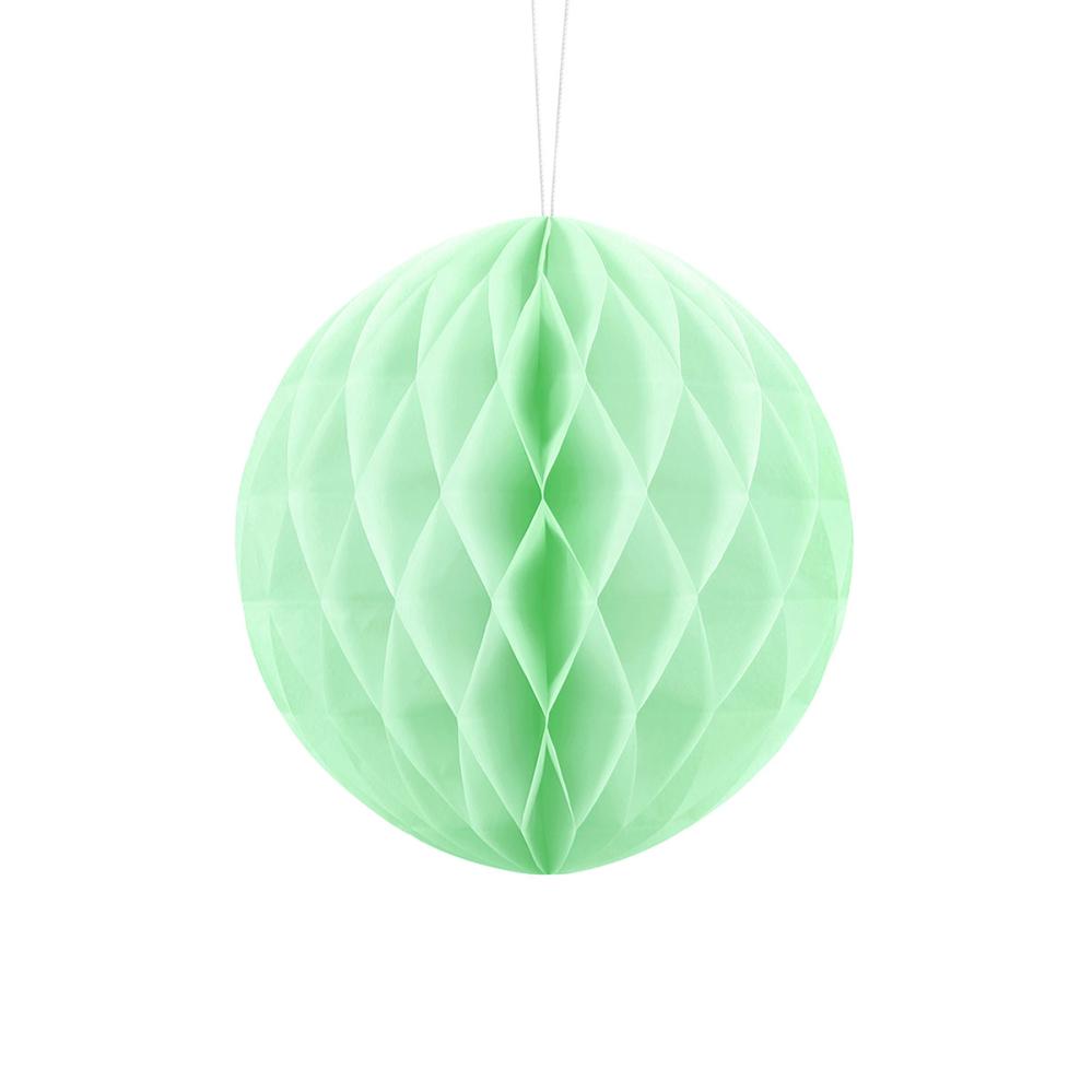Riippuva Hunajakenno Pistaasinvihreä 20 cm sisältää pistaasinvihreän, pallonmuotoisen hunajakennon, jossa on klipsit helppoon kokoamiseen, sekä valkoinen ripustusnaru.
