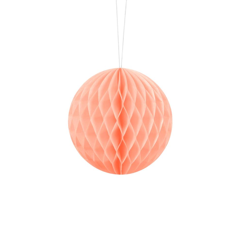 Riippuva Hunajakenno Vaalea Persikka 10 cm sisältää vaalean persikanvärisen, pallomaisen hunajakennon, jossa on klipsit helppoa kokoamista varten ja valkoinen naru ripustamista varten.