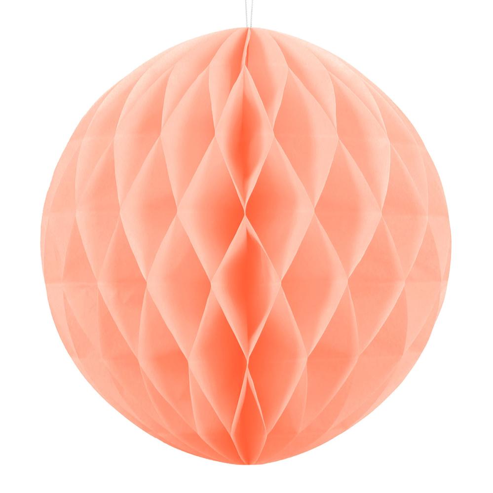 Elegantilla muotoilullaan tämä roikkuva koriste hunajakennon muodossa, vaaleansävyisestä oranssista paperista, tuo huoneeseen kauniin lisän. Jokainen paperipallo toimii tyylikkäänä koristeena, kun se ripustetaan kattoon.