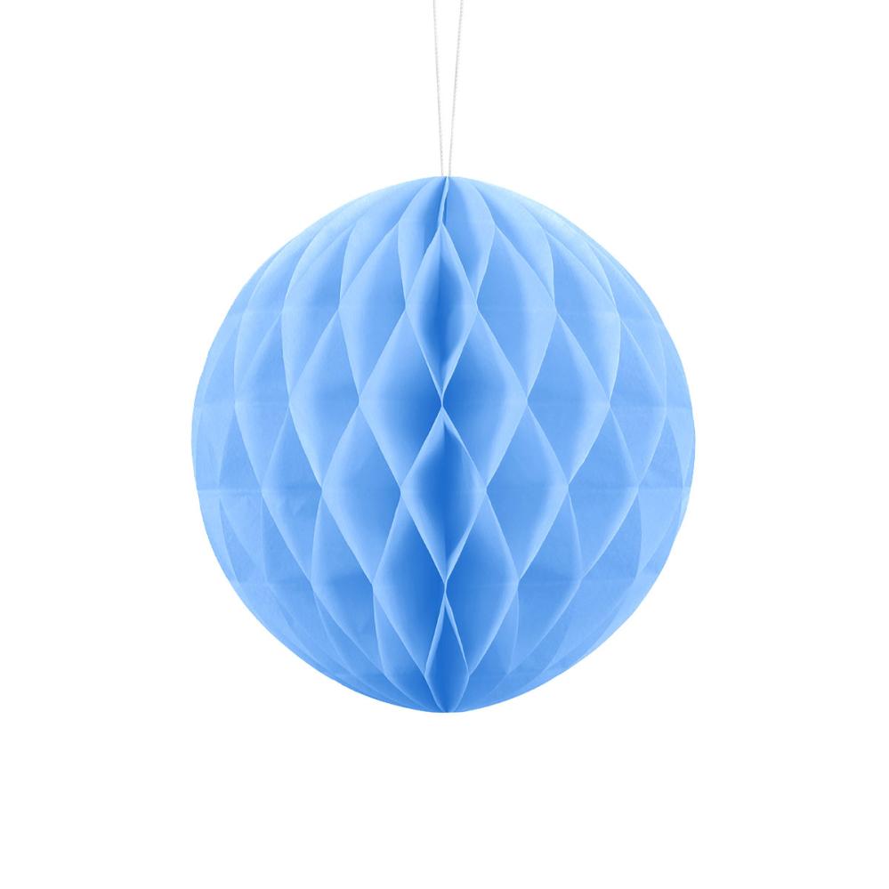 Luo tunnelmaa riippuvalla paperisella hunajakennokoristeella vaaleansinisessä sävyssä, joka sopii babyshowereihin, ristiäisiin ja lastenjuhliin, ja toimii myös ylioppilasjuhlakoristeena tai juhannuskoristeena. Tämä koriste on paperipallon muotoinen ja sen ripustaminen on helppoa.