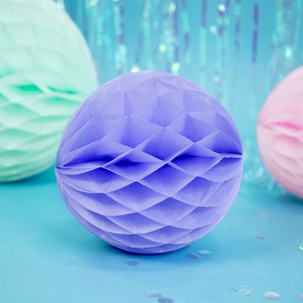 Violetilla paperisella hunajakennokoristeella luot roikkuvan koristeen, joka sopii täydellisesti esimerkiksi juhliin. Tällainen paperipallon muotoinen koriste antaa jokaiseen huoneeseen juhlavan ja leikkisän ilmeen.