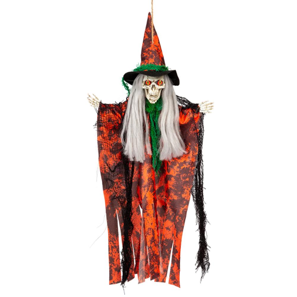 Riippuva Noita 60 cm sisältää riippuvan koristeen, jossa on luurankomainen noita, jolla on vaaleanharmaat hiukset ja joka on pukeutunut oranssiin ja mustaan asuun sekä yhteensopivaan noitahattuun.
