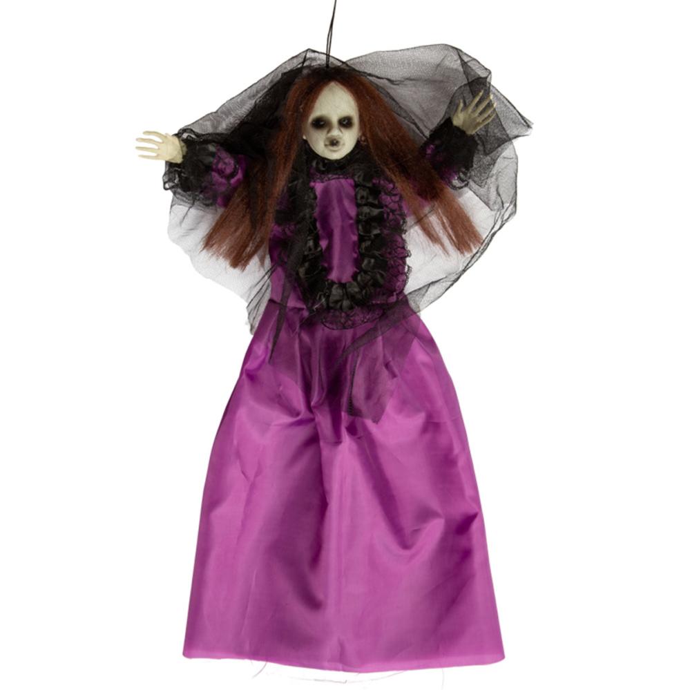 Riippuva Nukke 55 cm sisältää roikkuvan koristeen, joka on pelottava nukke ruskeilla hiuksilla, pukeutuneena violettiin ja mustaan mekkoon sekä mustaan huntuun.