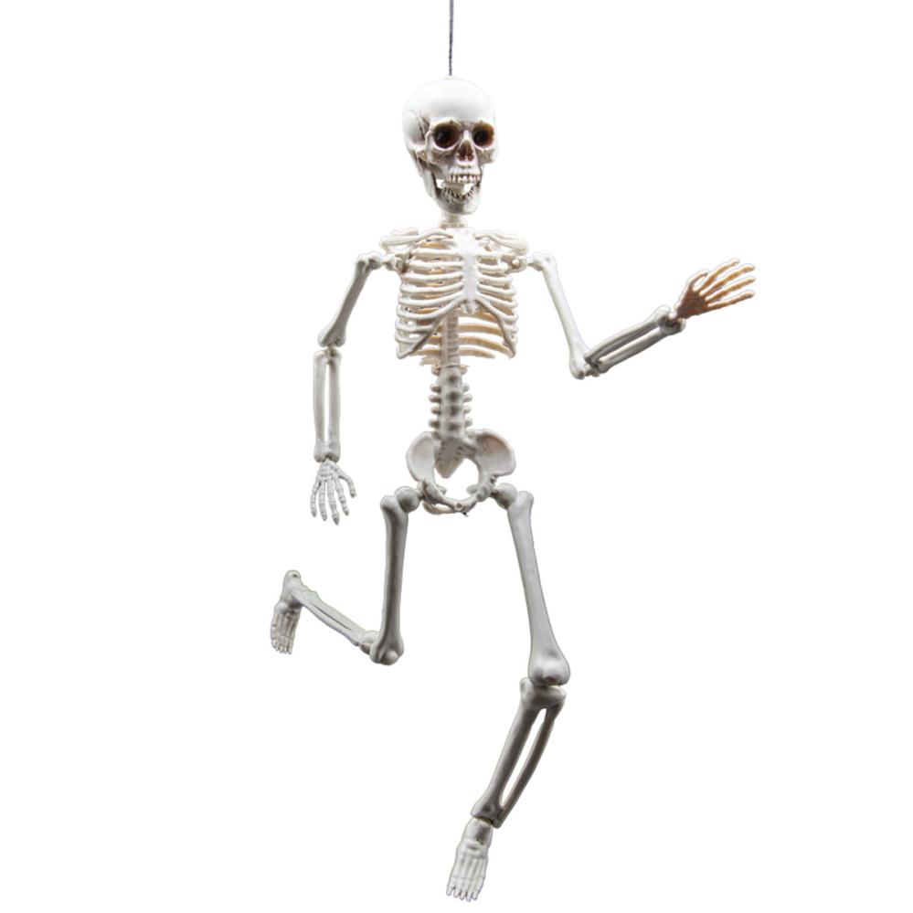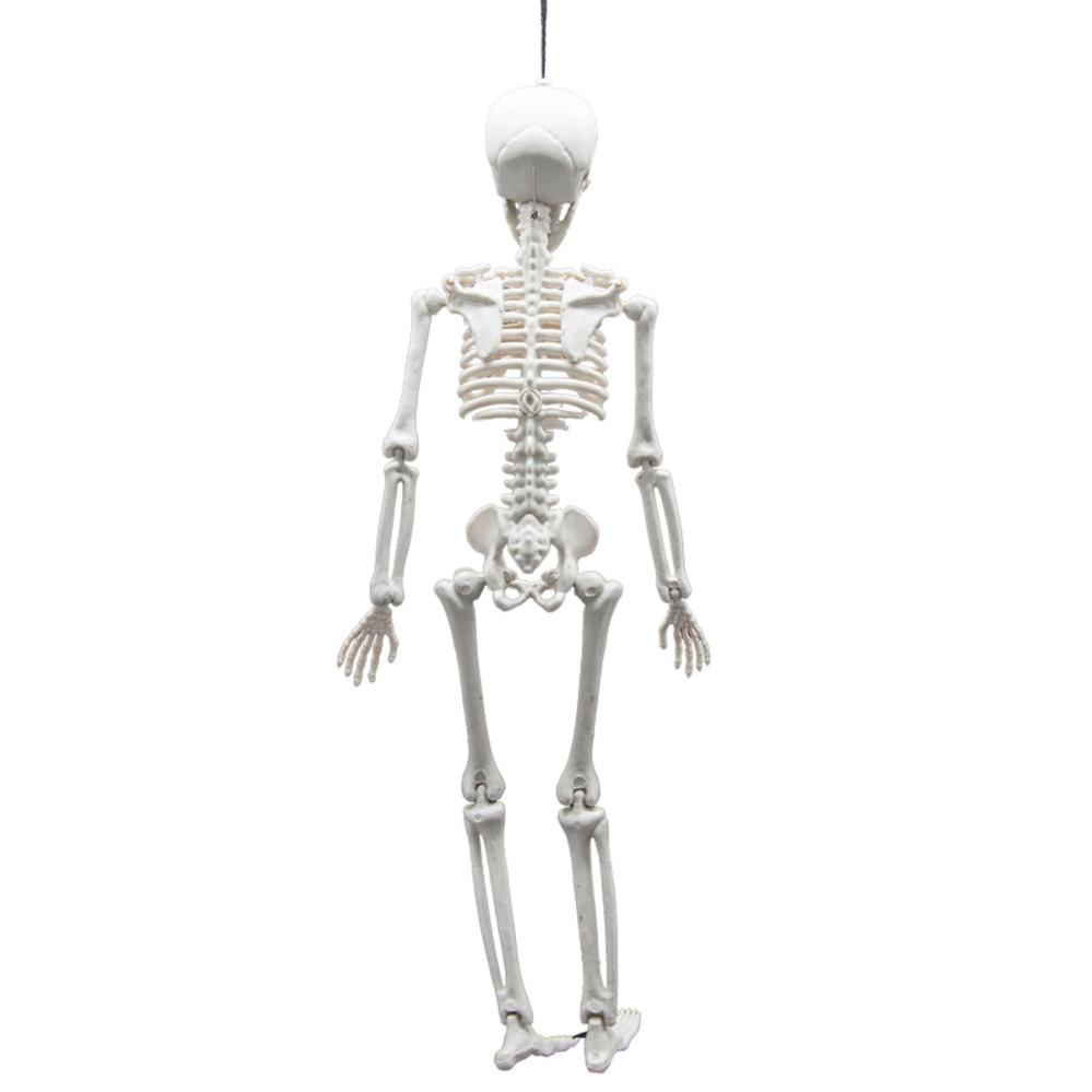 Riippuva Taivutettava Luuranko Prop sisältää luurangon, jonka voit helposti ripustaa luurangon päähän kiinnitetyn narun avulla. Luurangossa on säädettävät käsivarret, jalat, kädet, jalkaterät, pää sekä leuka, joten voit muotoilla sen mielesi mukaan.