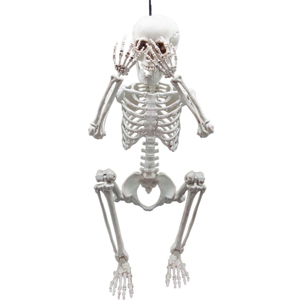 Riippuva Taivutettava Luuranko Rekvisiitta 60 cm sisältää luurangon, jonka ripustat helposti luurangon päähän kiinnitetyn narun avulla. Luurangossa on säädettävät käsivarret, jalat, kädet, jalkaterät, pää sekä leuka, jotta voit muotoilla sen mielesi mukaan.