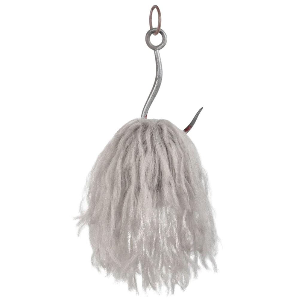 Riippuva Zombi-pää Valolla on riippuva halloween-koriste zombipään muodossa valkoisen ja harmaan sävyissä, ruskeilla sarvilla, valkoisilla hiuksilla ja verisillä yksityiskohdilla. Koristeessa on sisäänrakennetut punaiset LED-valot silmissä.