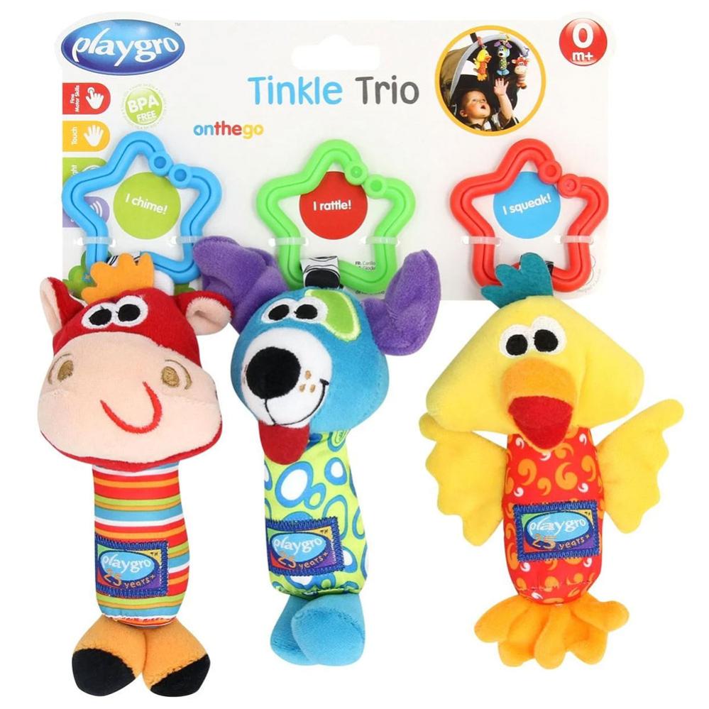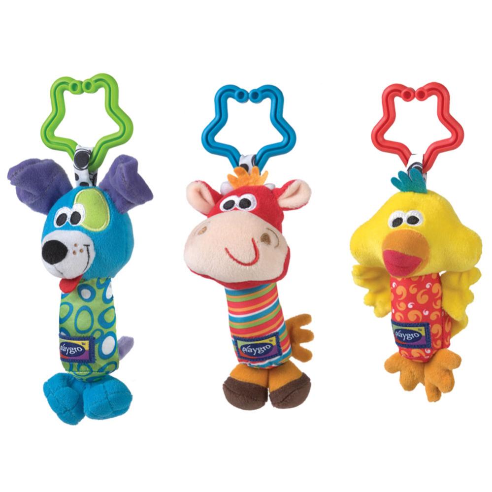 Riippuvat Lelut Eläimet 3 kpl sisältää kolme riippuvaa aktiviteettilelua, jotka ovat kananpojan, hiiren ja lehmän muotoisia. Jokaisessa lelussa on tähdenmuotoinen koukku, väriltään vihreä, punainen tai sininen, helppoa ripustamista varten.