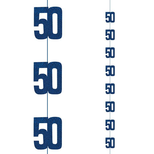 Riippuvat Numerot 50 Holografinen Sininen 6 kpl sisältää kuusi riippuvaa koristetta, joissa jokaisessa koristeessa on kahdeksan numeroa 50 holografisessa tummansinisessä värissä.