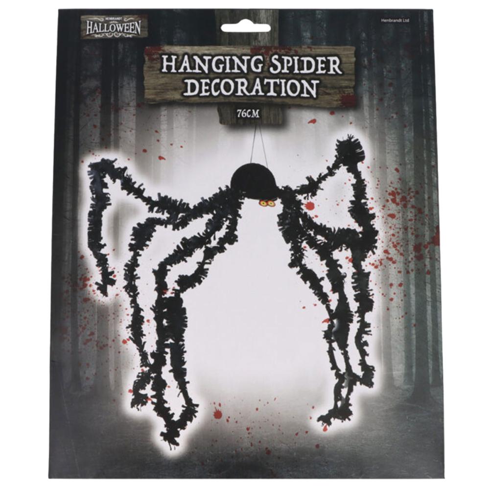 Rippuva Hämähäkki Koriste on Halloweenkoriste mustan hämähäkin muodossa. Itse hämähäkki on honeycomb-mallinen kooltaan 11x21 cm, ja sen jalkojen pituus on 76 cm. Koriste ripustetaan helposti kiinnitetyn mustan narun avulla, ja mukana tulee neljä paperiliitintä honeycombin koossa pitämiseen.