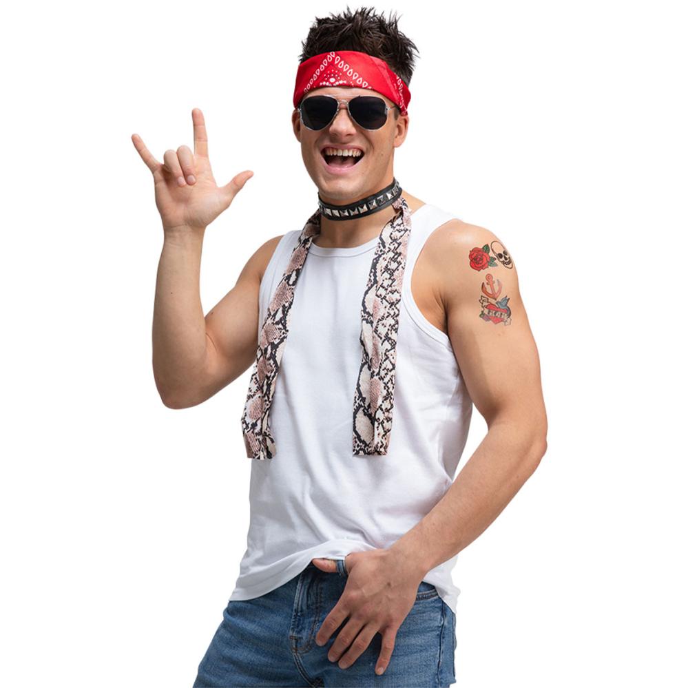 Rock Naamiaisasusteet 3-kpl sisältää punaisen bandanan, jossa on mustia ja valkoisia yksityiskohtia, pilottimalliset aurinkolasit hopeanvärisillä sangoilla ja mustilla linsseillä sekä mustan choker-kaulakorun, jota koristavat hopeanväriset niitit ja jossa on kiinni ommeltu käärmekuosinen huivi.