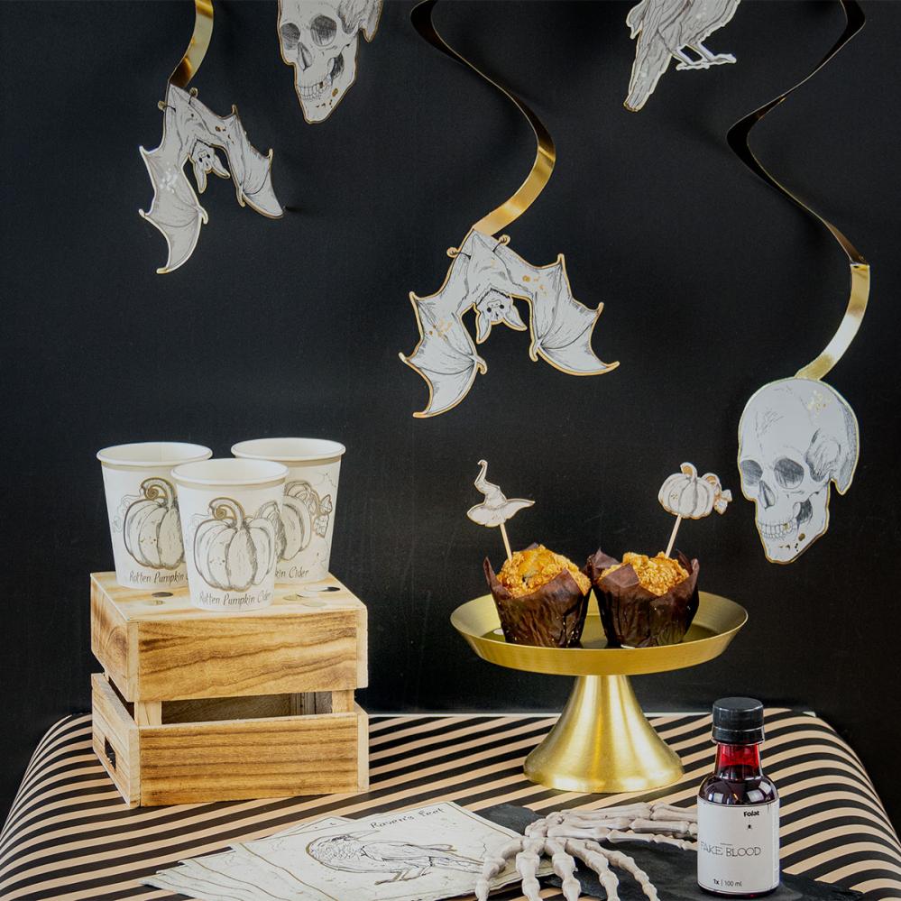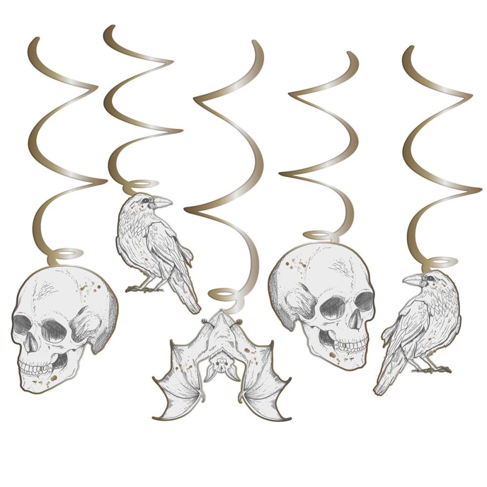 Roikkuvat Halloween Swirls 6-kpl sisältää 6 kpl kiiltäviä kullanvärisiä paperispiraaleja sekä niihin kuuluvat pääkallo-, korppi- ja lepakkoaiheet, jotka on painettu molemmin puolin.