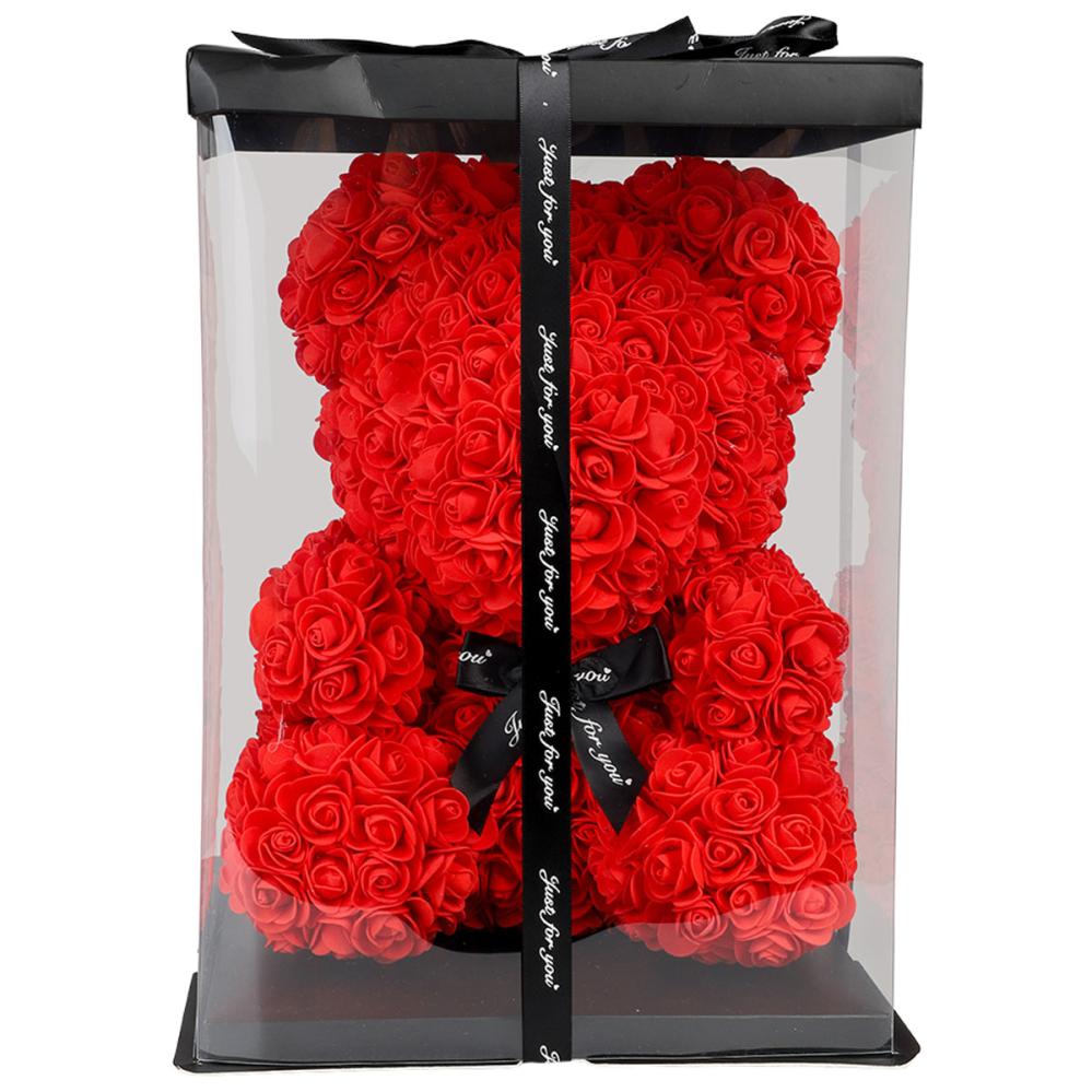 Rose Bear / Ruusukarhu 37 cm on suuri nallekarhu, joka on kauttaaltaan peitetty pehmeillä muoviruusuilla, kevyellä styroksisydämellä ja mustalla silkkirusetilla kaulan ympärillä, koristeltuna tekstillä "Just for you". Karhu toimitetaan läpinäkyvässä lahjapakkauksessa, jossa on nauha.