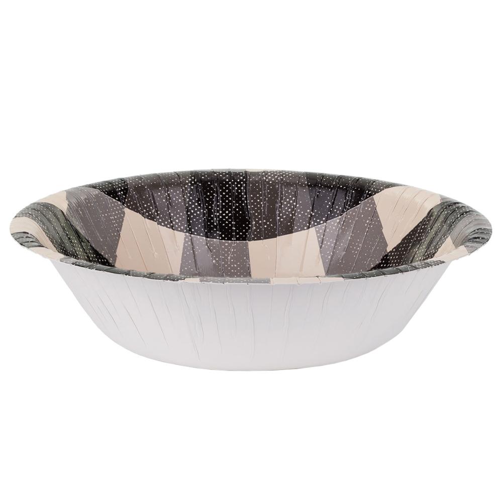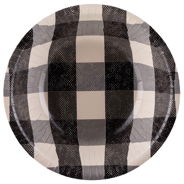 Ruudulliset Paperikulhot Musta 6 kpl sisältää kuusi syvää kertakäyttökulhoa, joissa on ruudullinen kuvio mustan, harmaan ja beigen väreissä.