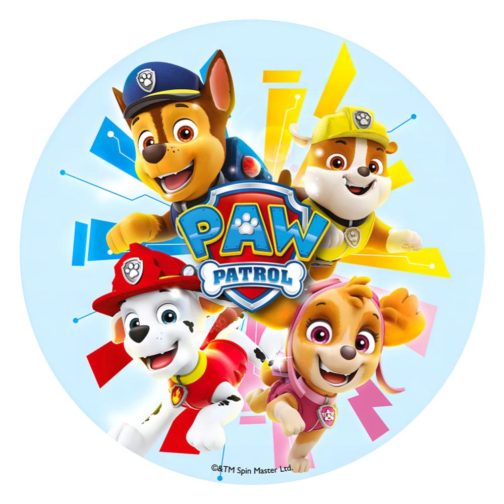 Paw Patrol Cake Image L Sokeritahna koostuu gluteenittomasta kakkukuvasta, jossa on Rubble, Chase , Skye ja Marshall siinä. Kakkukuvan halkaisija on noin 21 senttimetriä ja se asetetaan kakun päälle juuri ennen tarjoilua.