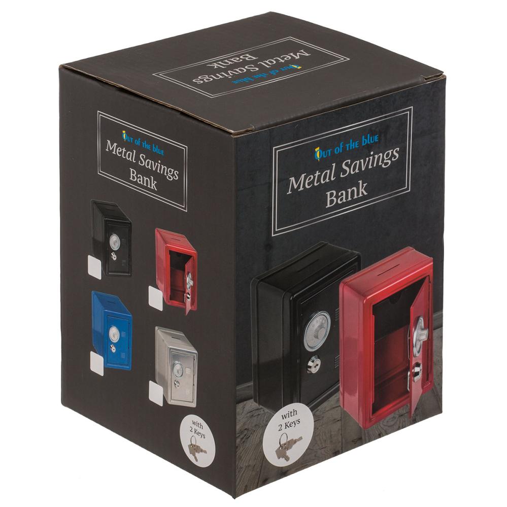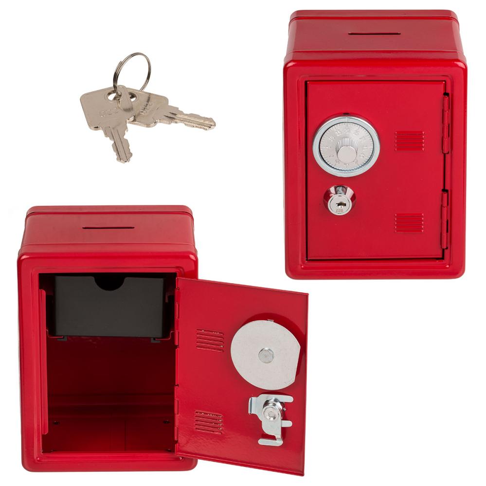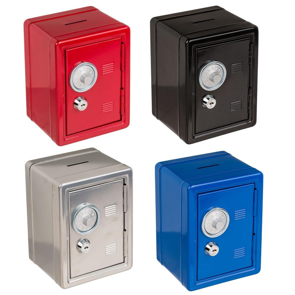 Säästölipas Kassakaappi 12 x 10 x 16 cm sisältää pienen metallisen kassakaapin, jossa on sekä yhdistelmälukko, avainlukko että kolikkorako yläosassa. Huomaa, että yhdistelmälukko ei toimi perinteisen lukon tavoin, vaan pikemminkin kahvana, ja että siinä on vain yksi numero. Tämä numero on esiasetettu ja ilmoitettu kassakaapin takana olevassa lapussa. Säästölipasta on saatavana väreissä musta, punainen, sininen ja hopea.