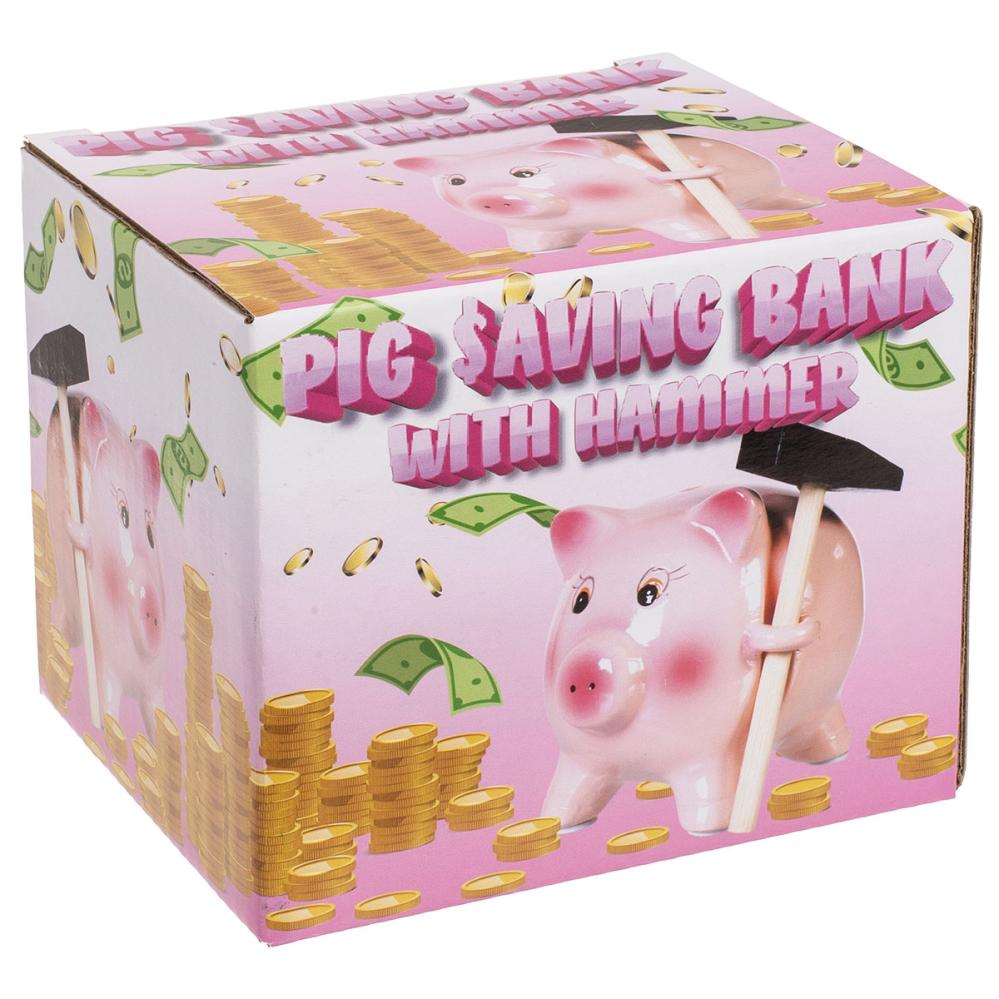 Säästöpossu Vasaralla 13 x 10,5 cm sisältää vaaleanpunaisen sian muotoisen säästölippaan, joka pitää kädessään irrotettavaa mustan ja ruskean väristä vasaraa. Rahat saa ulos vain rikkomalla säästölippaan vasaralla, sillä siinä ei ole aukkoa pohjassa.