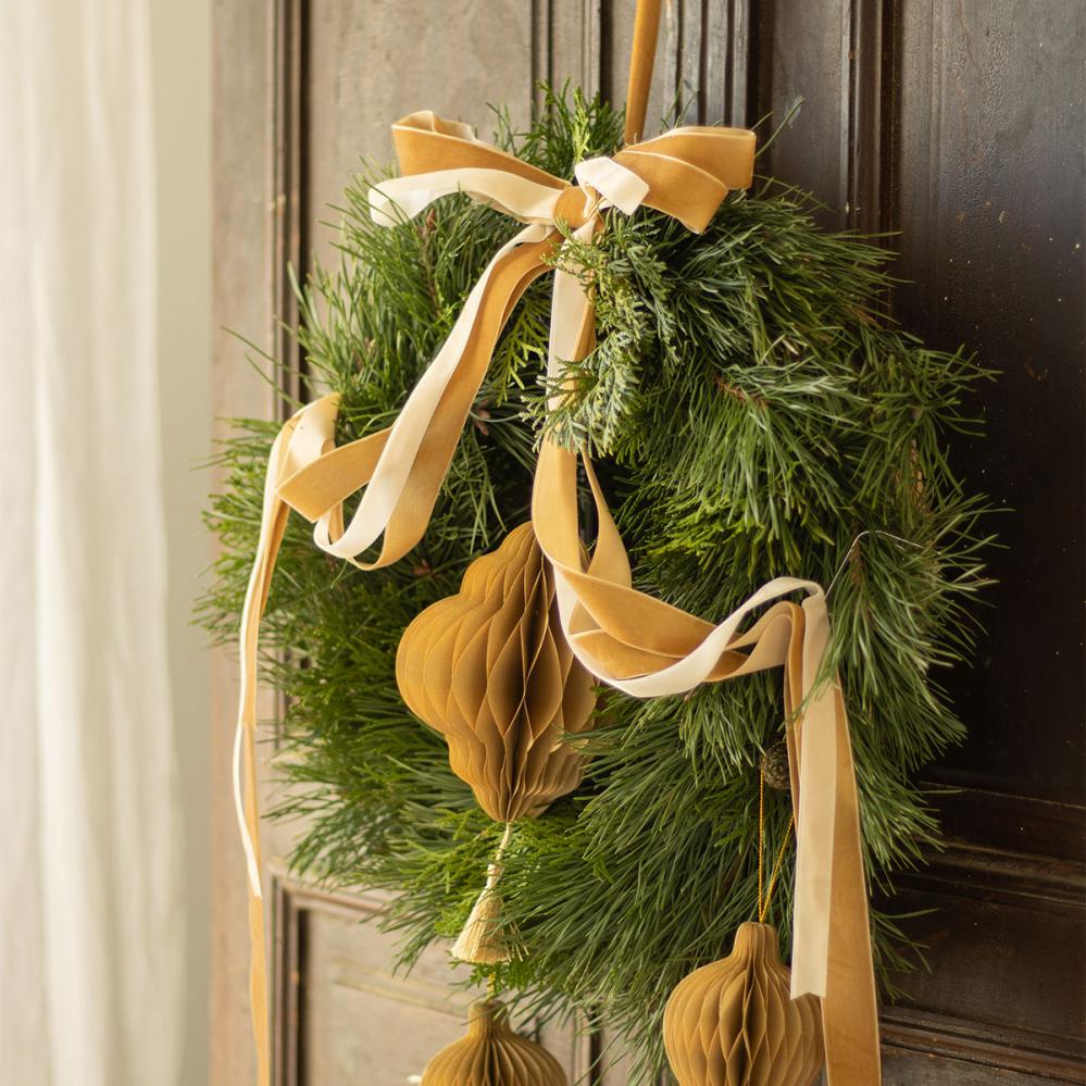 Tämä koristenauha kiinnittää nopeasti huomion sekä lahjapaketeissa että kattauksessa. Kun käytät rullalla olevaa kullanväristä nauhaa, syntyy uusia yksityiskohtia, jotka kohottavat kokonaisilmettä. Leveä kullanvärinen samettinauha luo lisäksi aina erittäin elegantin ja harkitun vaikutelman.