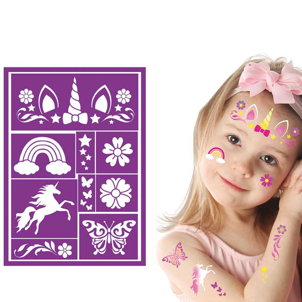 Luo taianomaisia koristeita yksisarvisjuhliin näillä liiloilla sapluunoilla. Yksisarvisen, sateenkaaren, perhosten ja kukkien kuvioilla voit helposti muuttaa kortit, seinät ja kutsut osaksi mielikuvituksellista ja värikylläistä juhlaa.