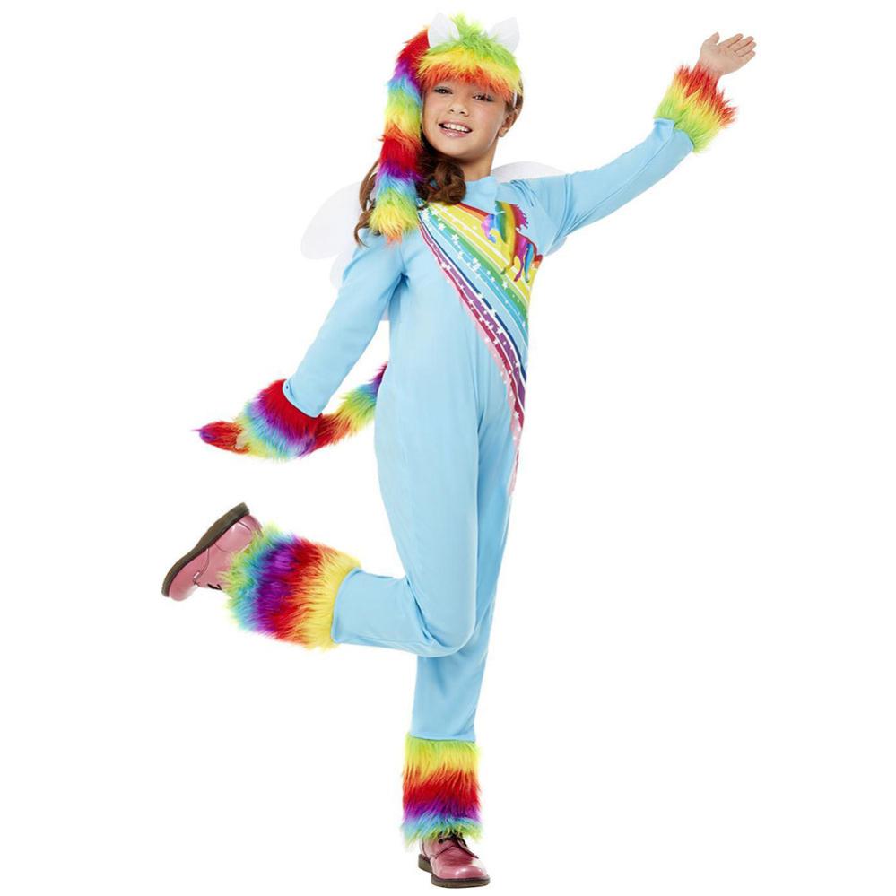Sateenkaariponi Naamiaisasu Lapsille sisältää kokovartalohaalarin, jossa on vaaleansininen väritys ja edessä suuri sateenkaari sekä sateenkaarenvärinen hevonen. Haalarin hihat ja lahkeiden suut ovat plyyshiä sateenkaaren väreissä. Asussa on myös plyyshinen sateenkaarihäntä ja valkoiset siivet. Mukana tulee lisäksi hiuspanta, jossa on yhteensopiva plyyshinen sateenkaarikuvio ja kaksi valkoista korvaa.