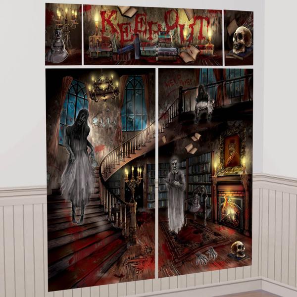 Seinäkoristelu Ghost House sisältää suuren seinäkoristeen muovimateriaalista 5 eri osasta. Seinäkoriste kuvaa viktoriaanisen talon aulaa, joka on täynnä autuaita henkiä ja aavemaisia yksityiskohtia, kuten veriroiskeita, jossa lukee "Pidä poissa". Sopii myös ulkokäyttöön. Kiinnitetään haluamallasi liimalla tai teipillä.