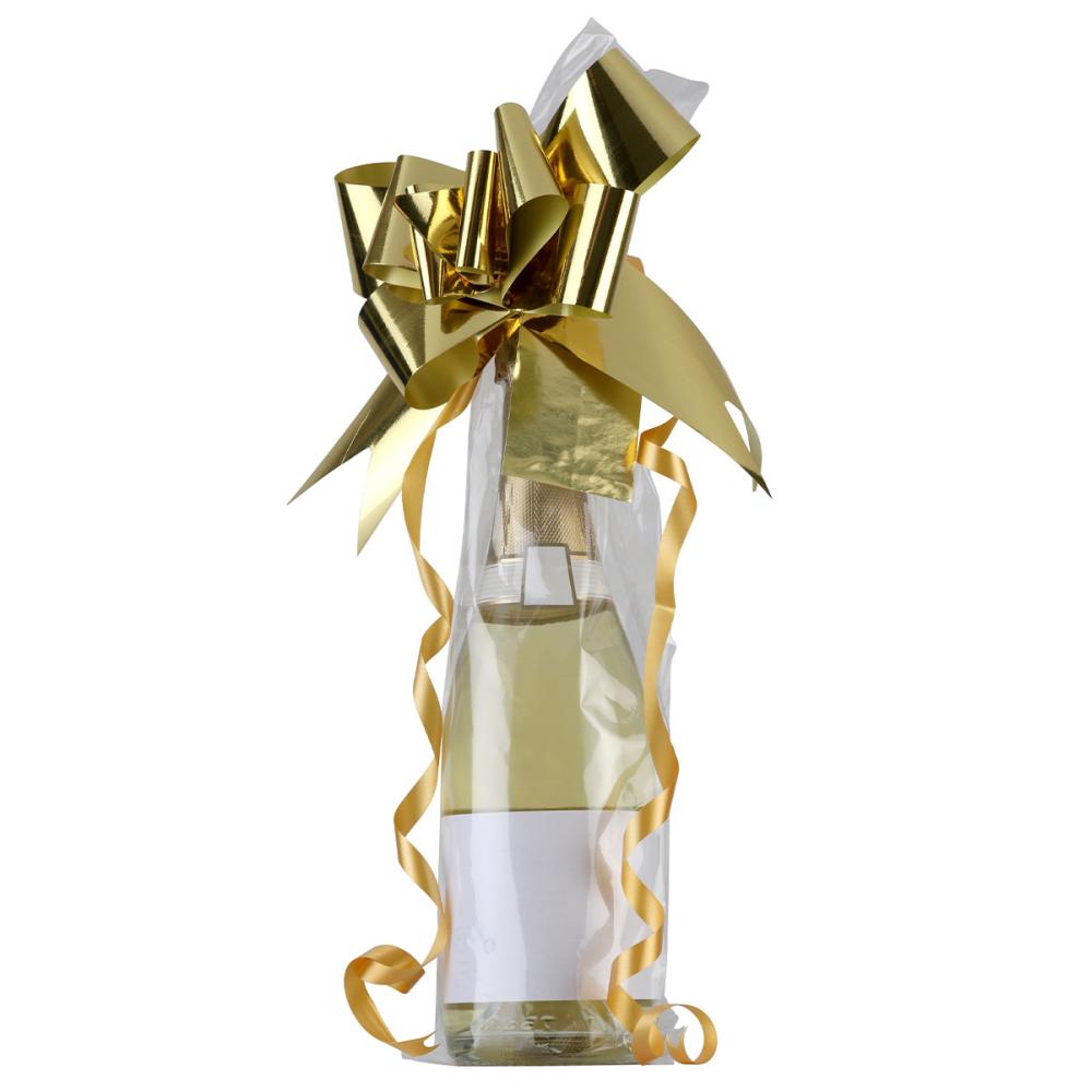 Käytännöllinen pullopussi on helppo täyttää, sopii lahjan antamiseen ja antaa sinun lisätä tervehdyksen ilman sotkua. Juhlallisessa sellofaanipussissa lahja tulee kauniisti esille, kun kullanvärinen rusetti sidotaan pullonkaulan ympärille.