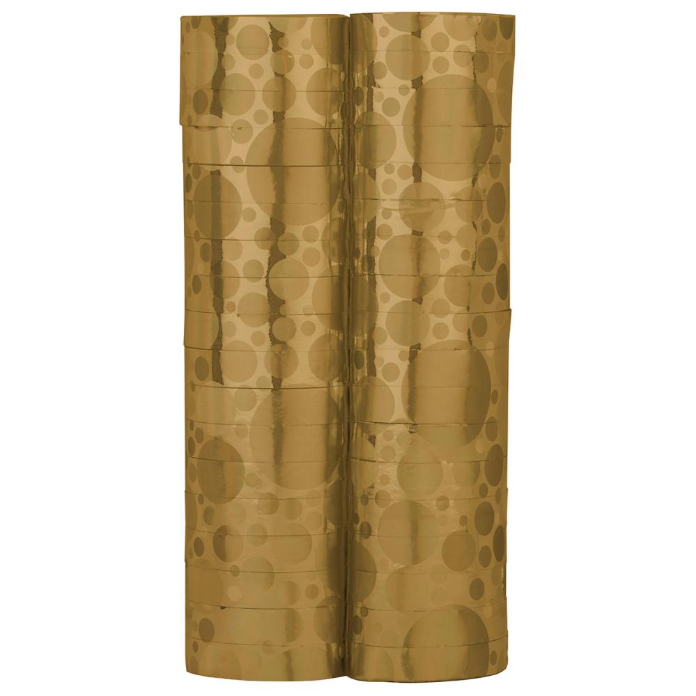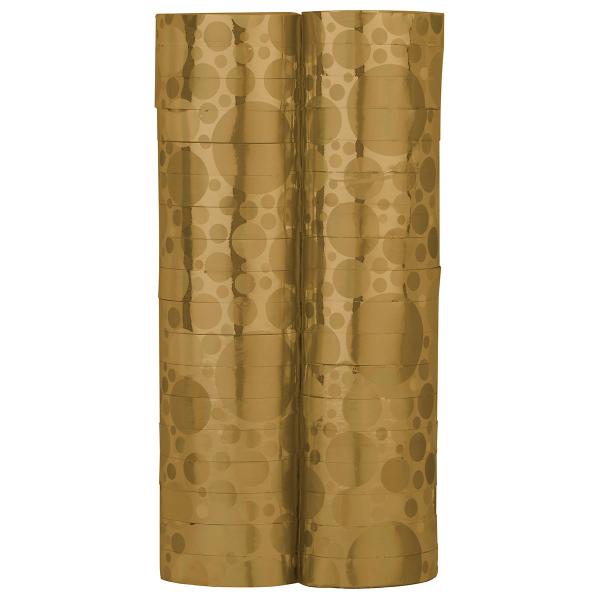 Serpentiinit Pilkuilla Kulta 2 kpl sisältää kaksi rullaa kimaltelevia kullanvärisiä serpenttiinejä, joissa on suuria ja pieniä pilkkuja, jotka hohtavat sateenkaaren väreissä.