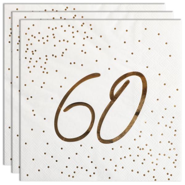 Servetit 60 vuotta Kulta Pilkuilla 16 kpl sisältää kuusitoista valkoista kertakäyttöservettiä, joissa on kolme kerrosta, luku "60" ja pieniä pilkkuja painettuna kiiltävällä kullalla yhdelle puolelle, kun taas muut puolet ovat täysin valkoisia.
