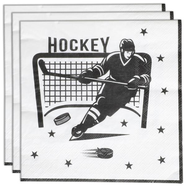 Servetit Hockey 16 kpl koostuu kuudestatoista valkoisesta 3-kerroksisesta kertakäyttöservetistä, joissa on musta kuvio luistelevasta jääkiekkoilijasta, jääkiekkomaalista, tähdistä sekä teksti "HOCKEY".