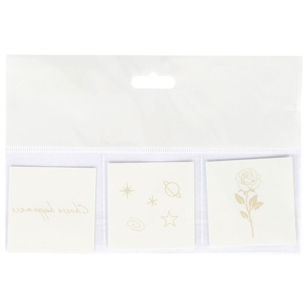 Siirtotatuoinnit Happiness 3-kpl sisältää kolme erilaista siirtotatuointia, joissa on avaruusaihe, teksti "Choose happiness" ja ruusu. Ne kiinnitetään helposti veden avulla.