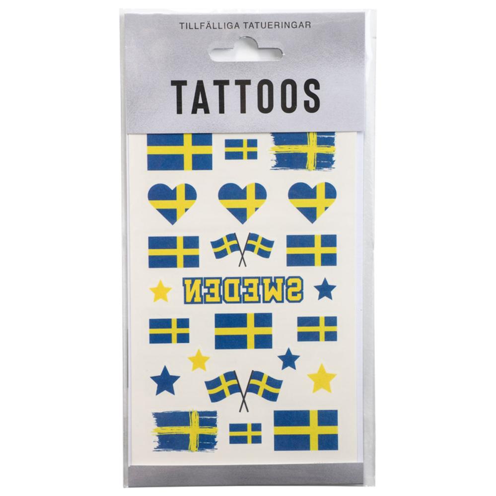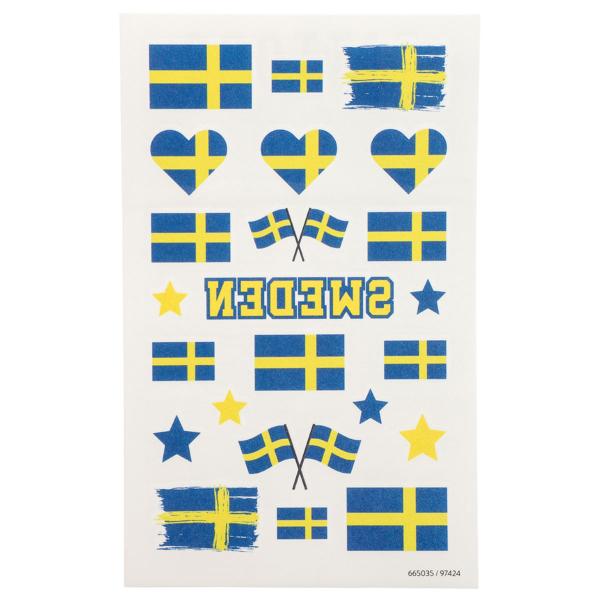 Siirtotatuoinnit Sverige 23 kpl koostuu arkista, jossa on 23 väliaikaista tatuointia Ruotsin lippujen ja muiden sinikeltaisten kuvioiden muodossa.