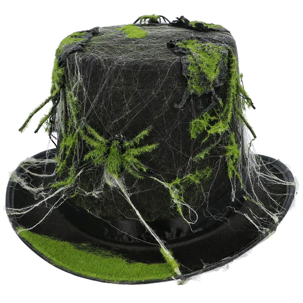 Tämä Halloweeniin sopiva naamiaishattu on musta silinterihattu, jossa on karmivia yksityiskohtia, kuten hämähäkinseittiä, sammalta ja pieniä hämähäkkejä. Täydellinen sinulle, joka haluat antaa asullesi pelottavan säväyksen.