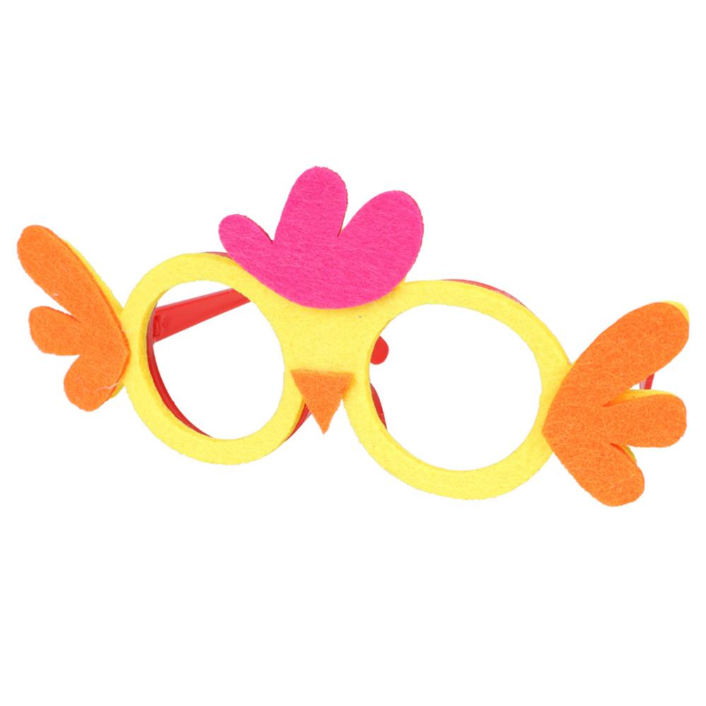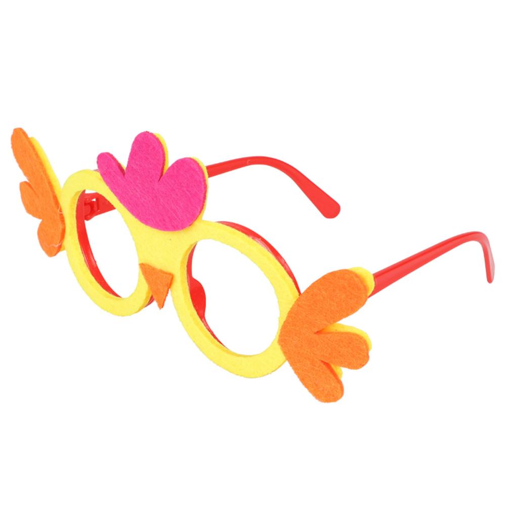 Silmälasit Kana 18x8 cm ovat linssittömät silmälasit, joissa on punainen muovikehys ja etupuolelle kiinnitetty huopakankainen koriste keltaisen, violetin ja oranssin kanan muodossa.