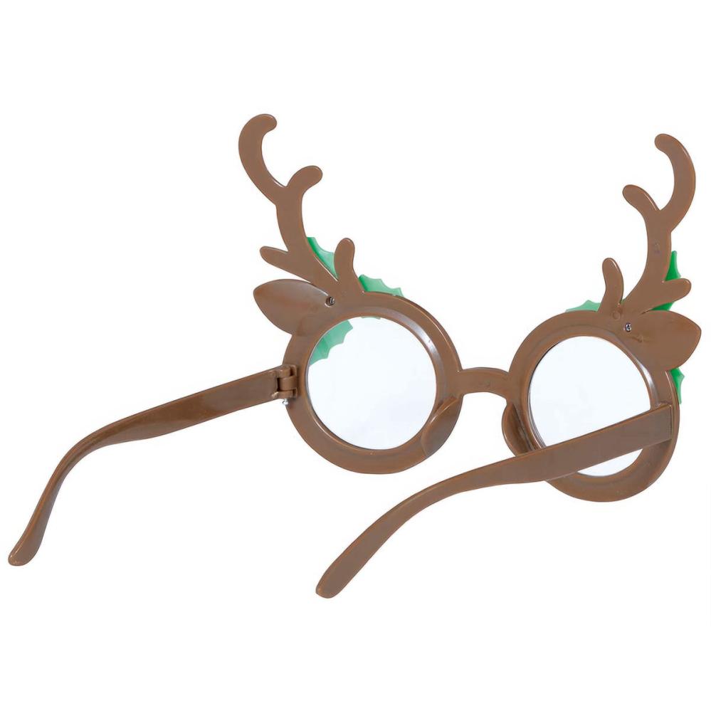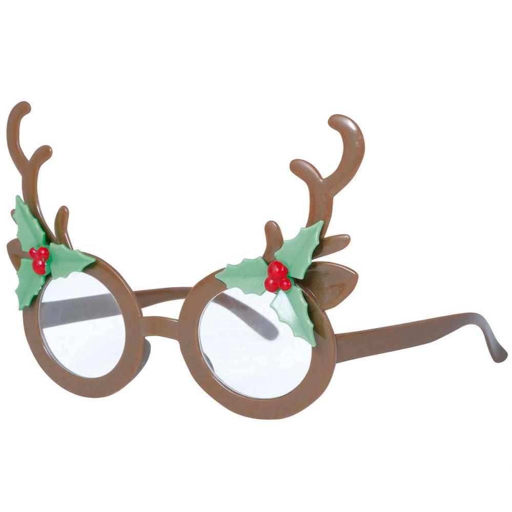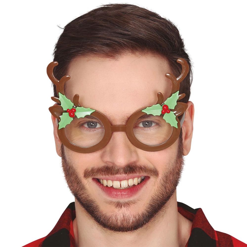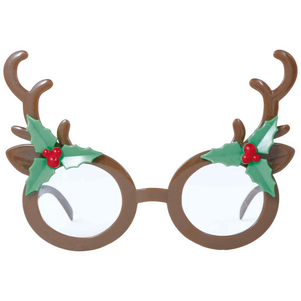 Silmälasit Poronsarvilla ja Mistelillä sisältävät silmälasit, joissa on ruskeat sangat ja jotka on koristeltu poronsarvilla ja joulumistelillä. Huomioithan, että silmälaseissa ei ole UV-suojausta.