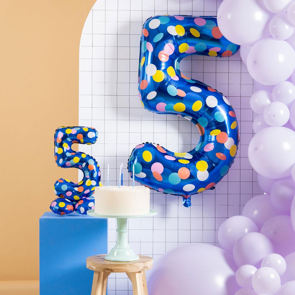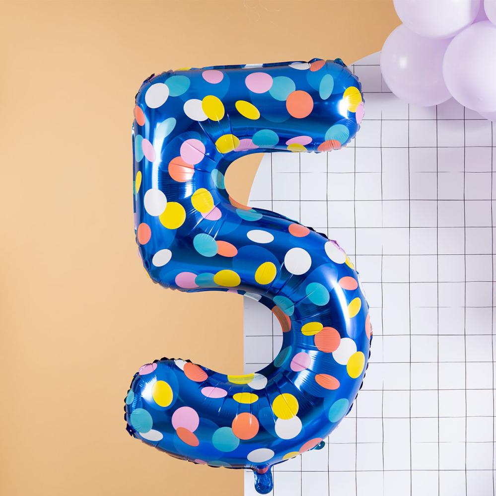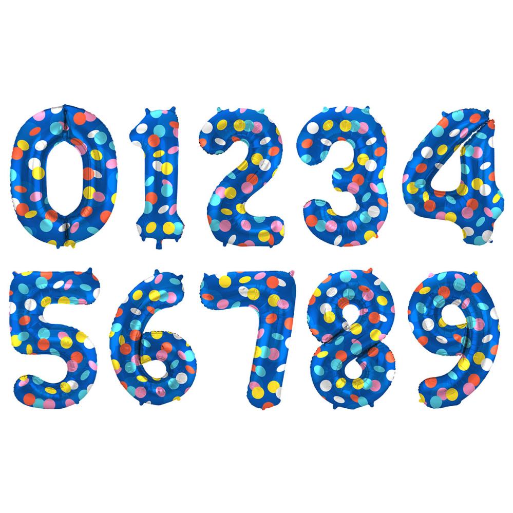 Sininen Numeroilmapallo Pilkuilla sisältää sinisen numeron muotoisen foliopallon, jossa on monivärisiä pilkkuja.