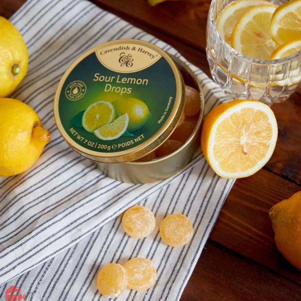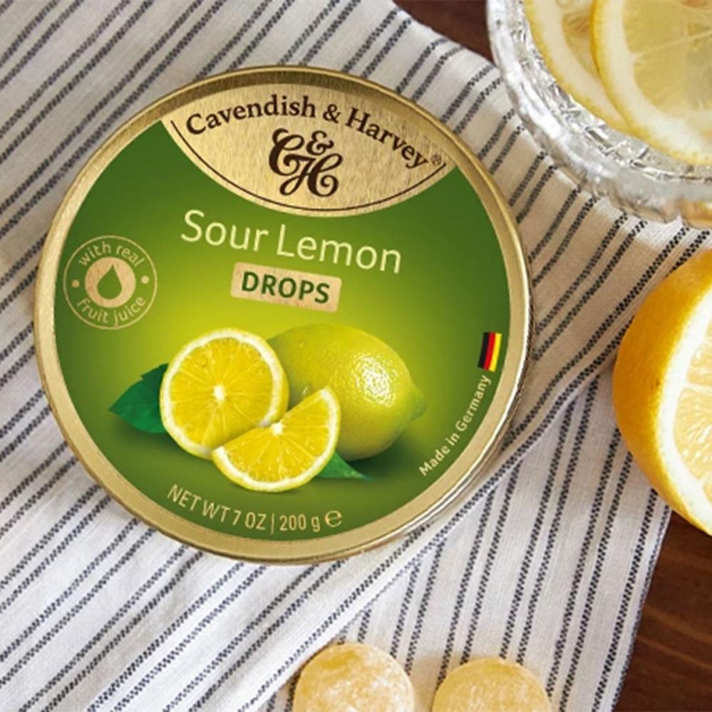 Cavendish & Harvey Drops Sour Lemon ovat kirpeän raikkaita kovia karamelleja peltirasiassa. Intensiivisen happamat sitruunanmakuiset karamellit tarjoavat makuräjähdyksen, joka sopii täydellisesti, kun kaipaat jotain raikasta.