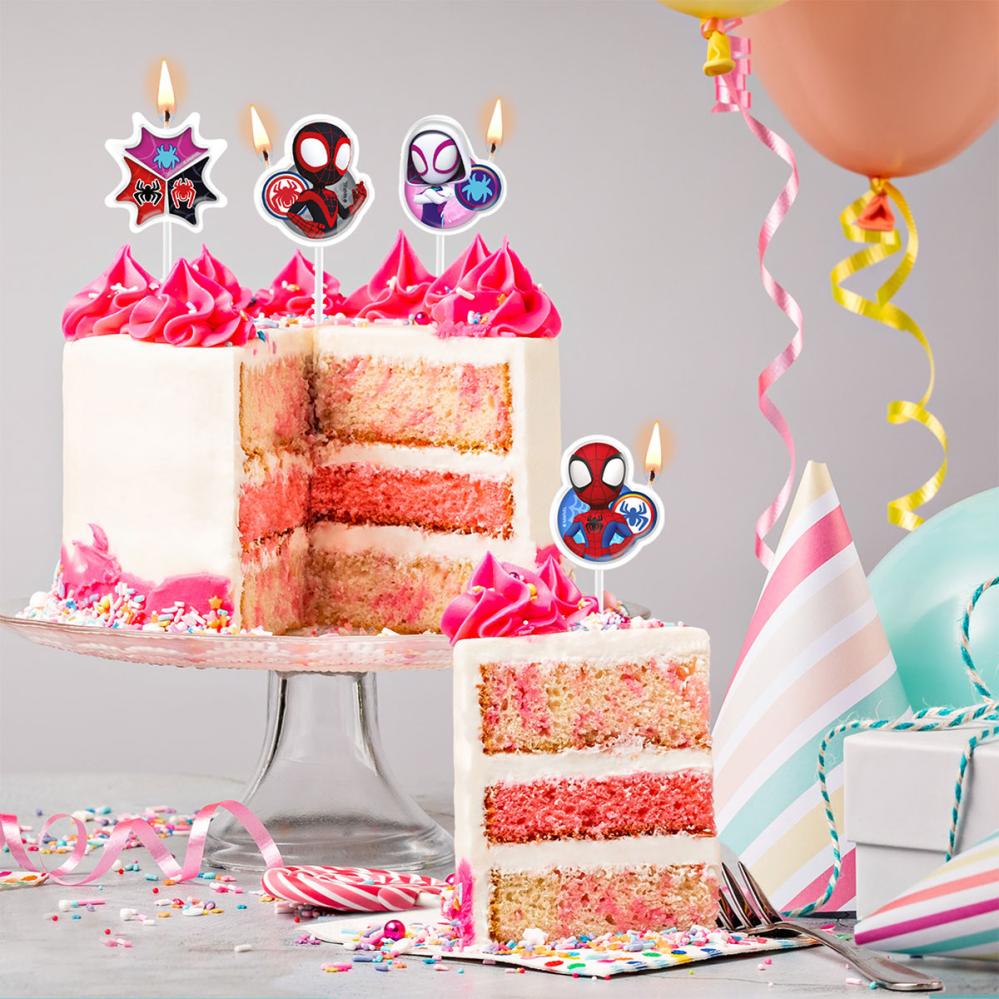 Tee syntymäpäivästä entistä hauskempi Spidey-teemaisilla kakkukynttilöillä. Tämä 4 kappaleen pakkaus on täydellinen kakkukoriste lastenjuhliin ja sitä koristavat Spidey, Ghost-Spider, Spin sekä heidän siistit logonsa.