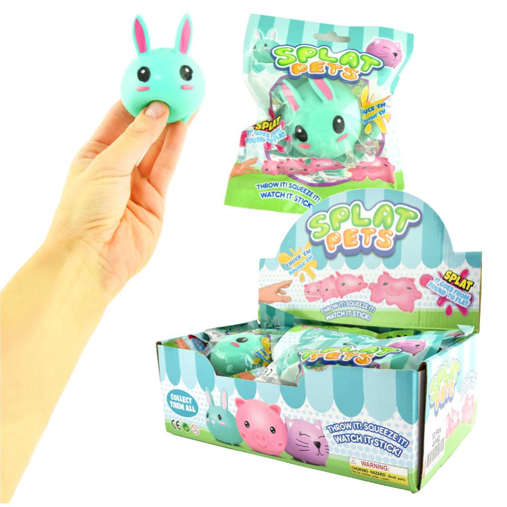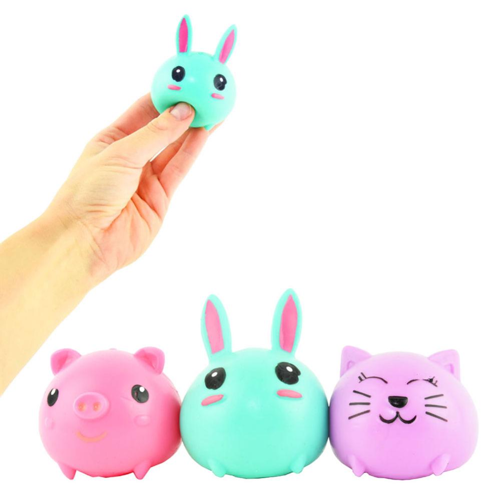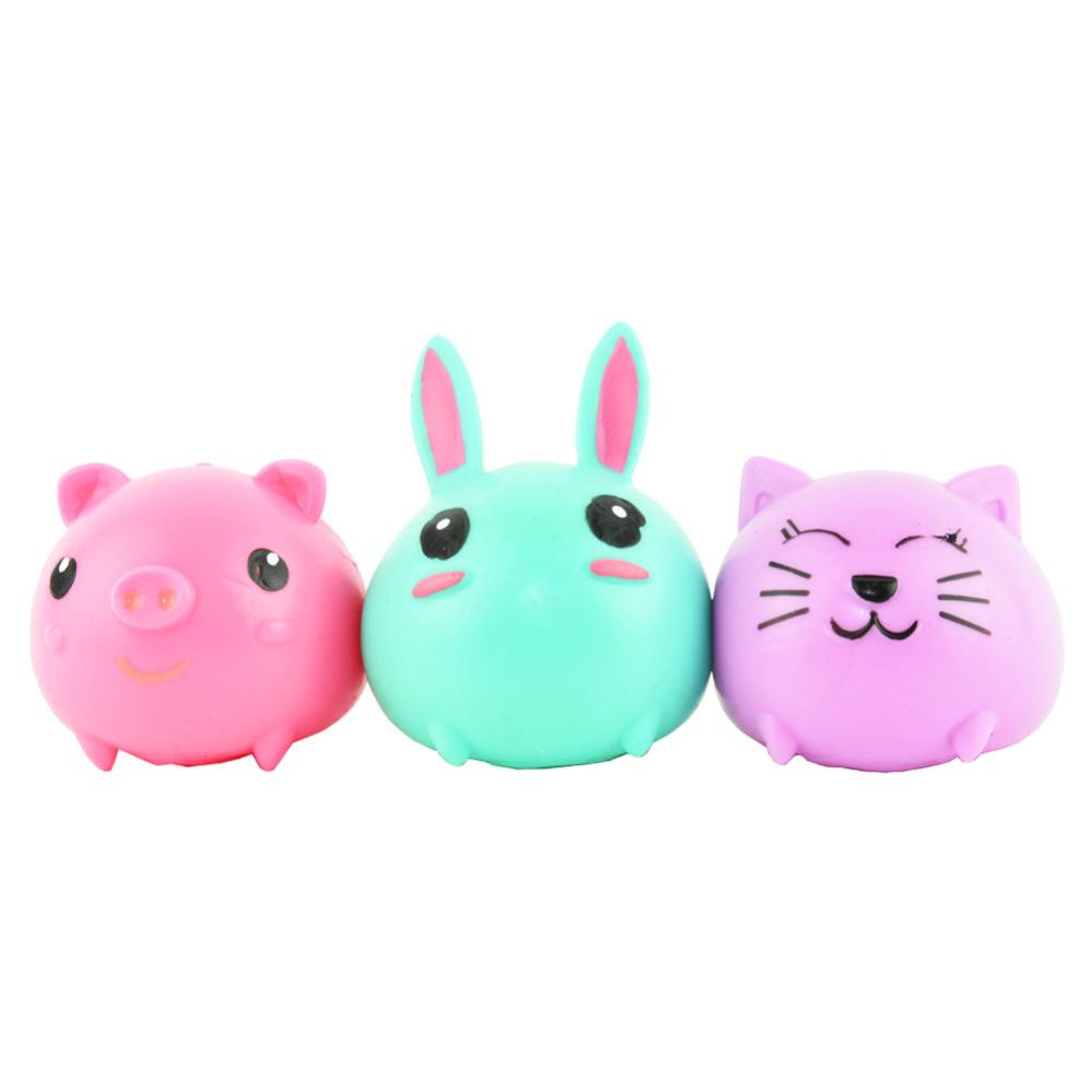 Splat Ball Eläin sisältää hauskasti stressipallon suloisen pyöreän eläimen muodossa, joka tulee litteäksi, kun heität sen lattiaa tai seinää vasten, ja palaa sitten alkuperäiseen muotoonsa. Splat-pallo on noin 6 cm suuri ja saatavilla on vaaleanpunainen kissa, turkoosi kani tai pinkki porsas, minkä saat on yllätys.