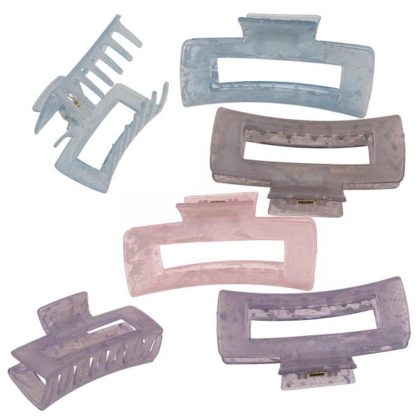 Suorakulmainen Hiusklipsi Marmori 10 cm on suorakulmainen hiusklipsi, jossa on kevyesti läpikuultava pinta ja marmoroitu kuvio. Hiusklipsiä on saatavana neljässä eri värissä.