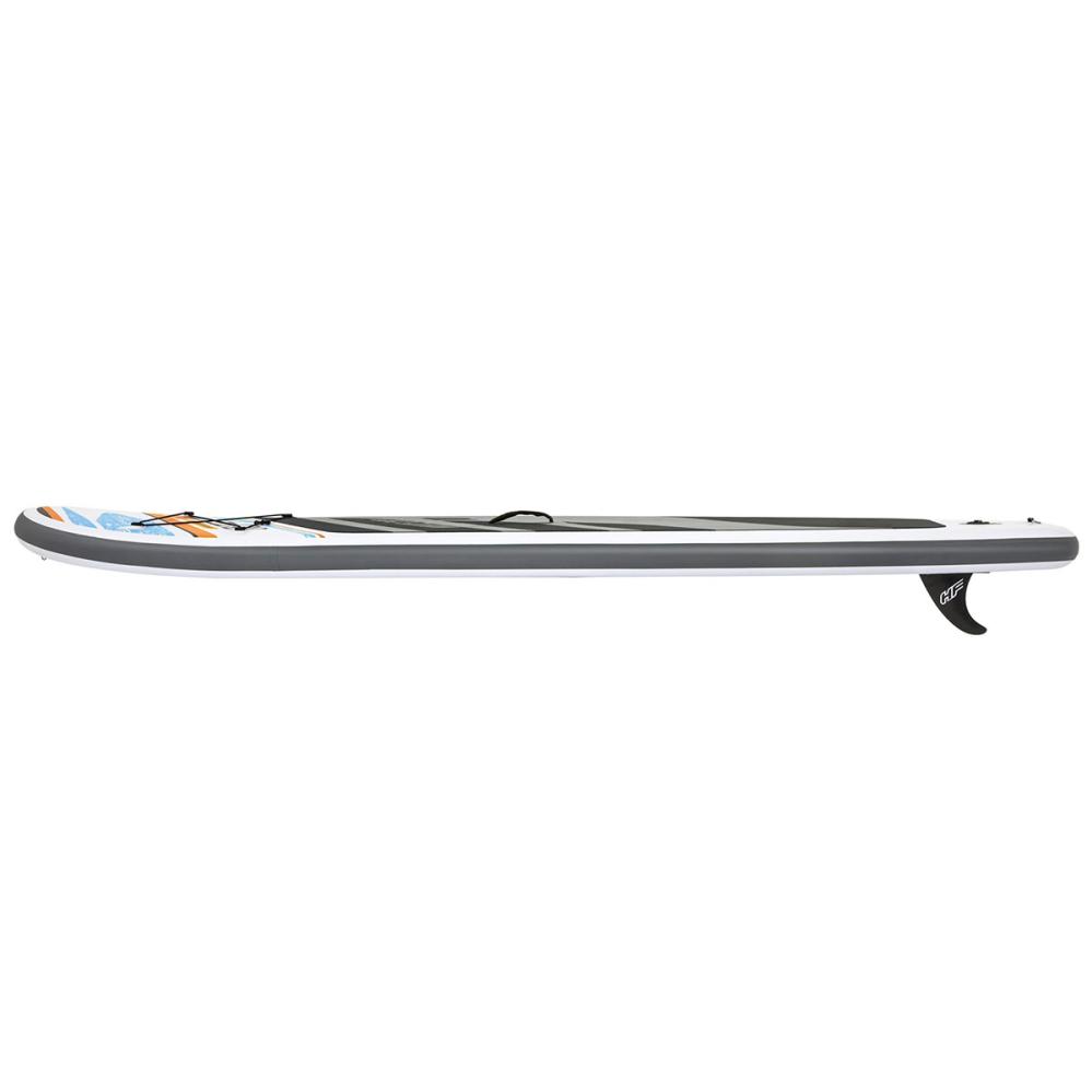 Sup-lauta Puhallettava White Cap Set sisältää puhallettavan melontalautan valkoisena, sinisenä, oranssina ja erilaisissa harmaan sävyissä, säädettävän mustan melan, irrotettavan mustan takaevän, mustan käsipumpun, mustan kantolaukun keltaisilla yksityiskohdilla, mustan surffihihnan ja korjaussarjan. Lauta on varustettu kantokahvoilla ja liukuesteellä, ja se on valmistettu dropstitch-tekniikalla lisäjäykkyyden ja kestävyyden takaamiseksi.